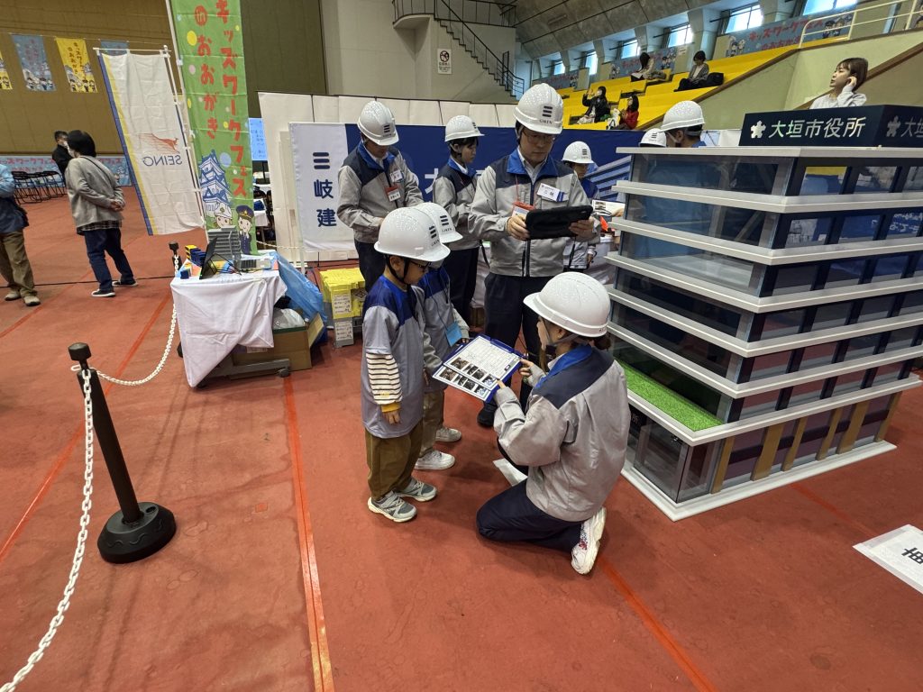 子ども達には「建設スタッフ」として建物の検査や工事写真の撮影を行い、大垣市役所の建設を体験していただきました。