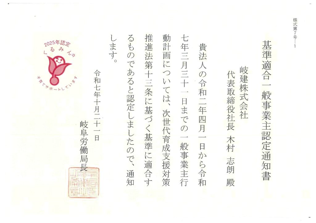 岐阜労働局より「くるみん認定」を頂きました