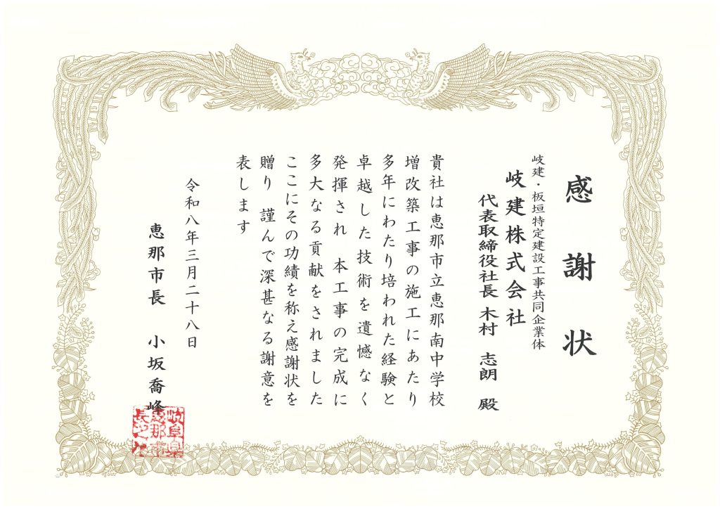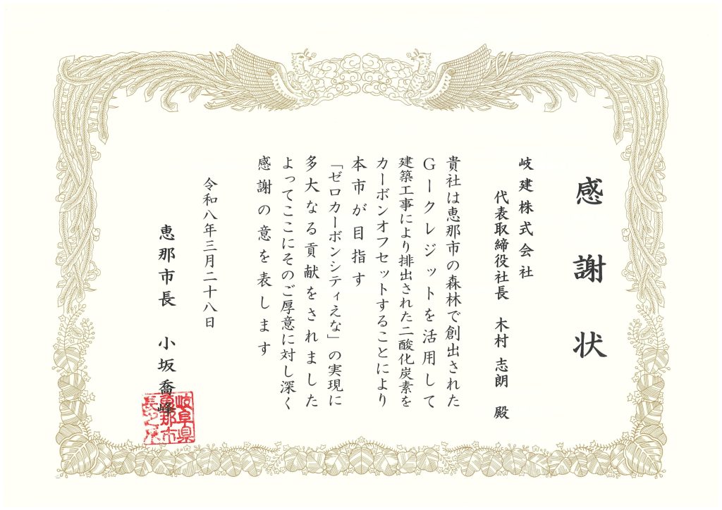 この度、恵那市長様より「感謝状」を頂きました。